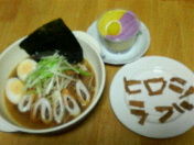 ヒロシといったらやっぱりラーメンかな〜と思って作りました。文字はシナチクです。「ヒロシラブ」と一生懸命並べてる自分がちょっと面白かった(笑)写真撮影のあと、このヒロシラブはすべてラーメンの海に沈めてばりばりいただきました。美味しかった〜(^▽^)もやしとネギそしてシナチクいっぱいの野菜たっぷりラーメンです。あと煮玉子。煮玉子は簡単なのでおすすめです、ゆで卵の殻をむいてめんつゆと水1:1の液に漬けとくだけです(レシピ出典は「All