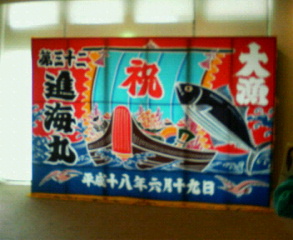 ↓は終演後に撮った、グローブ座ロビーに飾ってあった大漁旗。私なんぞが言うのはおこがましいですが、この進海丸という作品は、三宅さんの演劇キャリアに小さからぬ進歩をもたらしたと言えるのではないかと思います。そうさ祭り上げられるだけが芸じゃないぜよ。舞台人としての三宅さんに、これからも実り多い大漁の波が来ますようにとお祈り申し上げつつ。