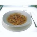 青山のお店とかはコースが主なのかなぁ、でもこちらは東京駅という場所柄(?)、単品メニュー(パスタ)がメイン。写真左、とてもあの喧騒かまびすしい東京駅構内とは思えません。。時間的にご飯時よりちょっと早かったためもあり、店内は実に静か。雰囲気よし。「パンチェッタと玉葱のトマトソース ”アマトリチャーナ”」というのをいただきました。写真右(950円だっけかな?1000円しなかった)。あと本日のデザート(300円)もいただきました。お値段リーズナブルだよねぇ。本日のデザートはレモンのパンナコッタと何やら(忘れた)の二者択一で、パンナコッタのほうをオーダー。
