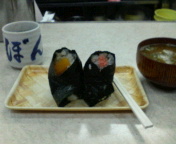 で、おにぎりはですね、握りぐあいがとても甘いというか、ぎゅっとじゃなくて実にふわっと握ってあるんですよ。手で持って食べてると崩れてくること必至。ってか実際、早々に崩れました(^w^;)箸で食べたいなこれ!と思うとそこにはちゃんと割り箸がある親切設計。箸も使いつつ美味しくいただきました。味は美味しかったです!たくあんキムチぴりっとしてて美味しかったー。おにぎりは1個220円、お豆腐の味噌汁を付けて、しめて599円。なめこの味噌汁だともうちょっとお値段が上がった気が。
