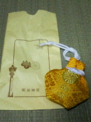 かわいい色のお守りがあったので買ってみました。「福守」。福々しさを感じつつ寝間の枕元に置いております。